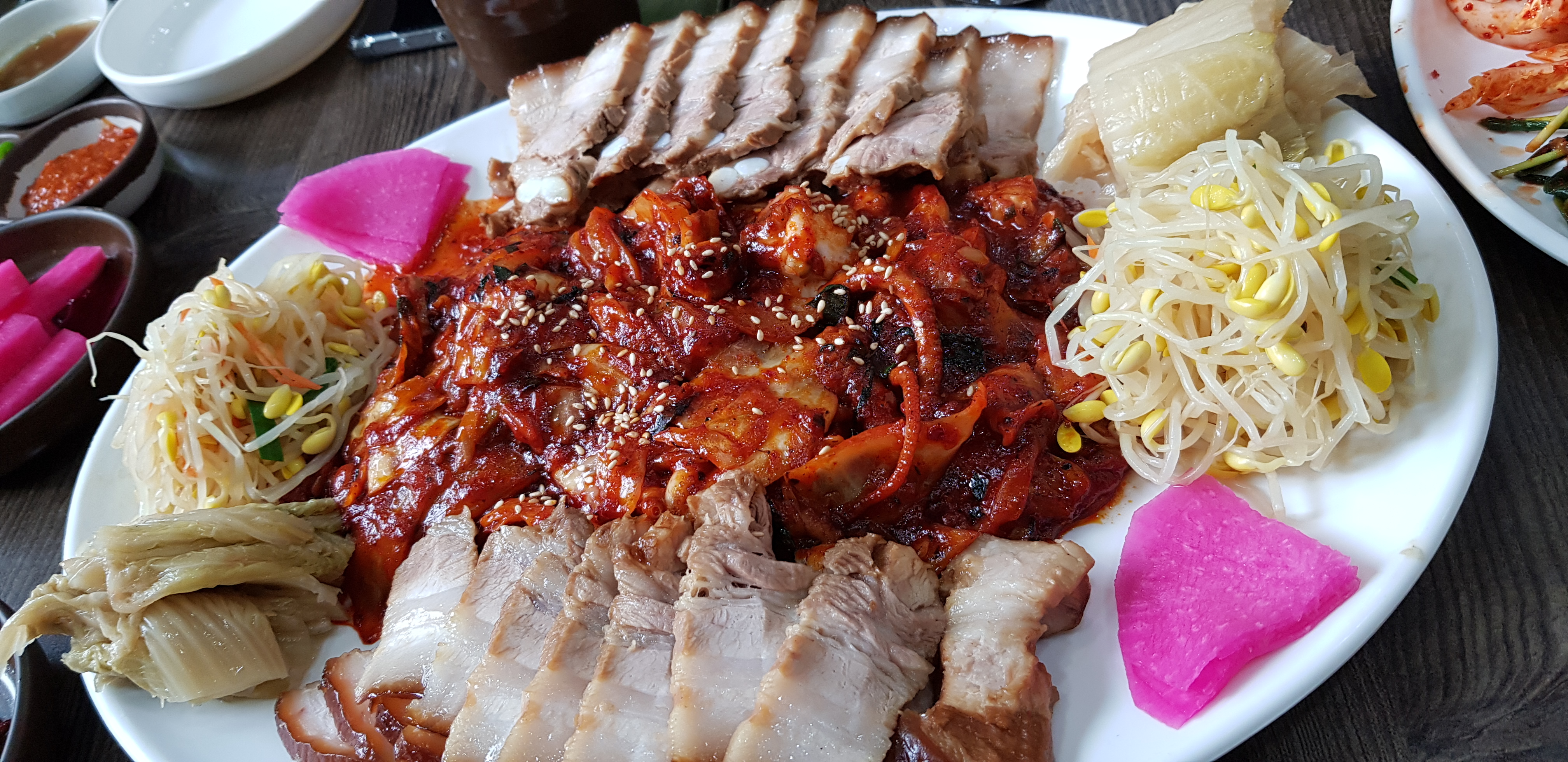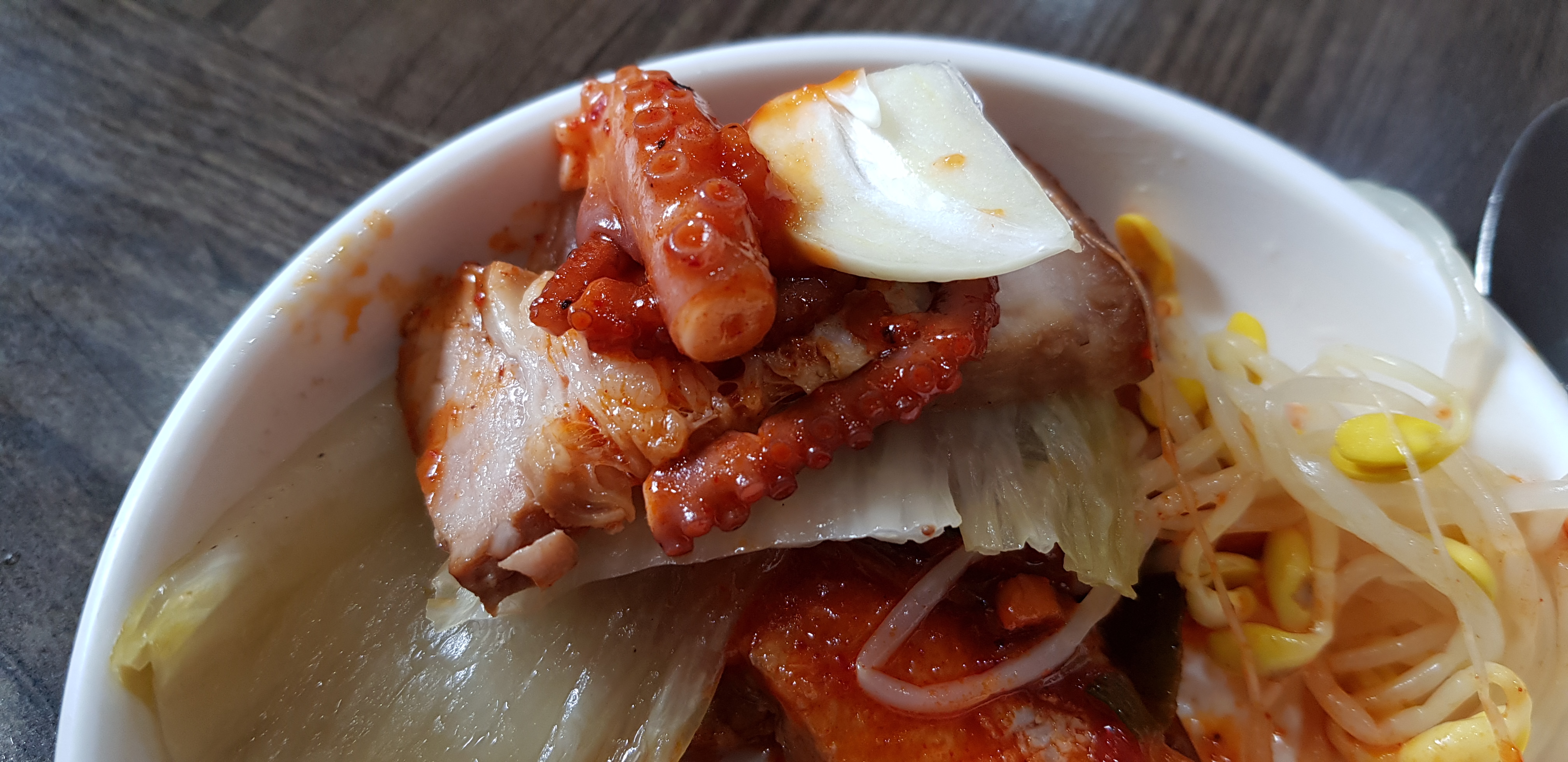잘 삶아진 수육과 빨간 낙지볶음, 콩나물과, 김치가 들어 있습니다.