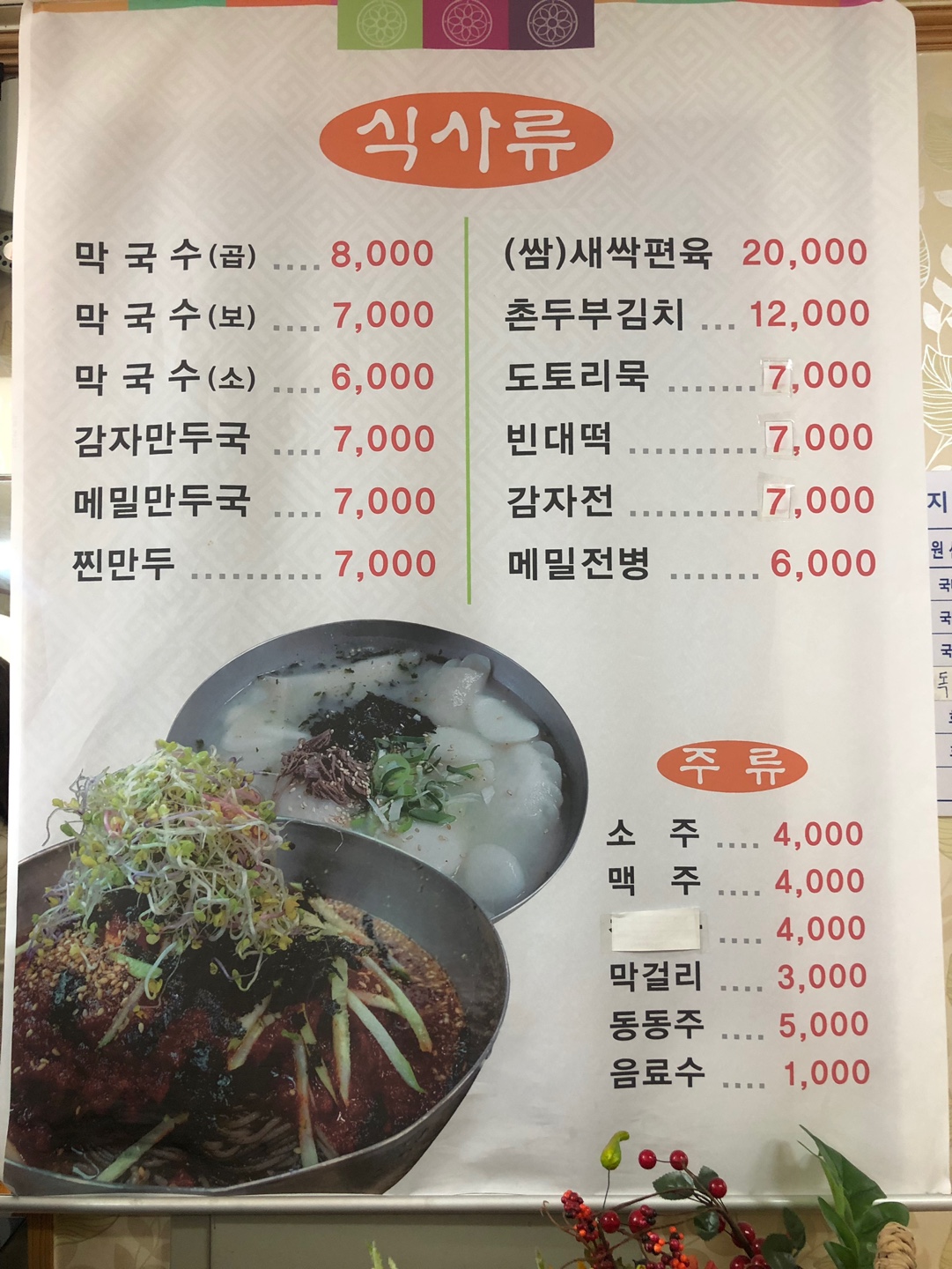 메뉴판입니다. 가격은 여느식당과 비슷합니다. 막국수와 만두국이 주 메뉴입니다.