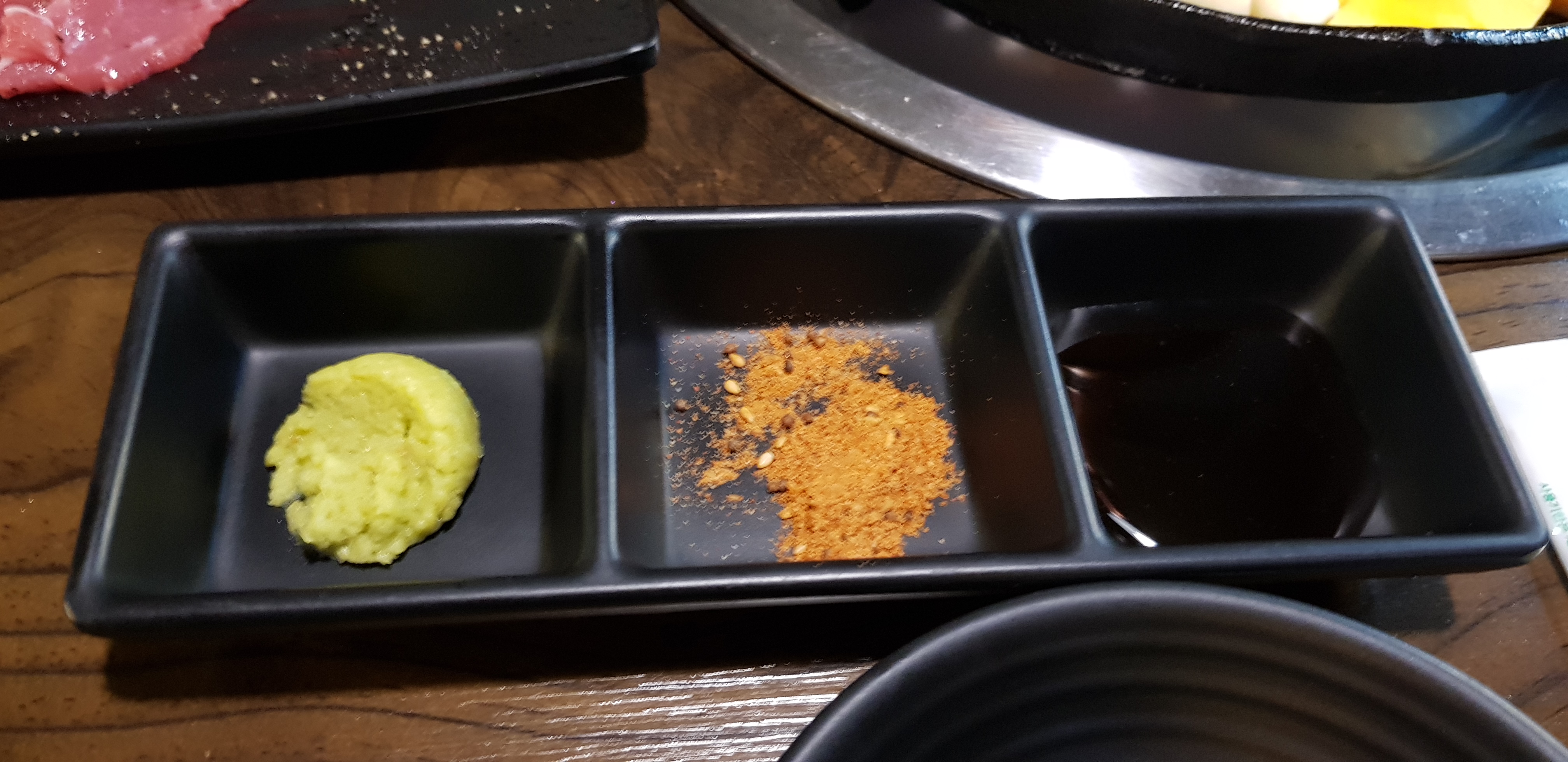 생와사비, 양꼬치 먹을때 나오는 양념이죠? 커민? 큐란? 쯔란인가... 그리고 또 하나의 소스까지 세가지.