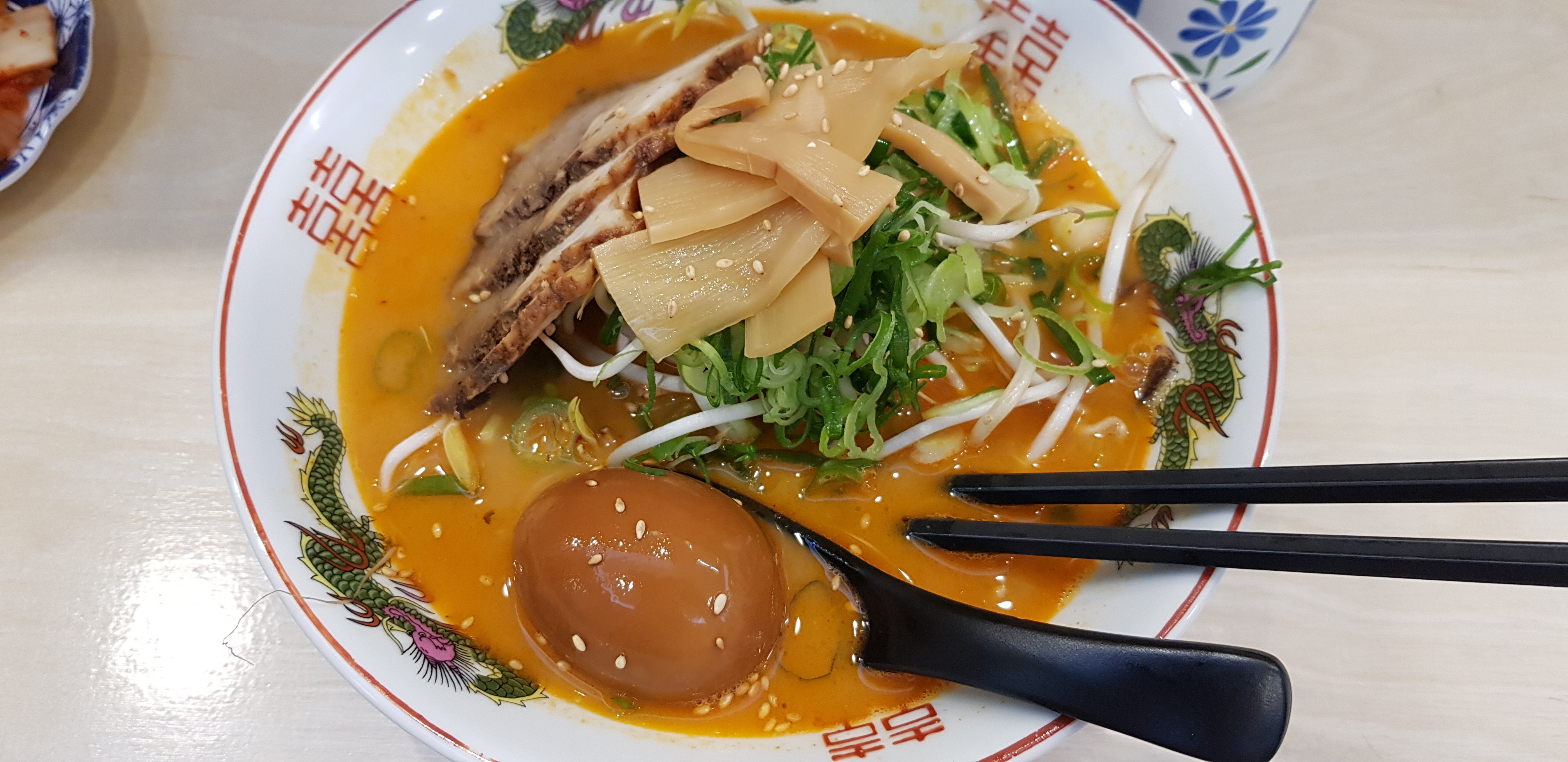 매운맛 2단계로 시켜서 많이 맵지 않을까 했는데 제 입엔 맵지 않습니다. 신라면과 비슷한 정도? 조금 더 매운 정도입니다. 고명으로는 생 숙주나물, 차슈4장, 반숙계란, 생파, 죽순, 목이버섯채가 들어 있네요.