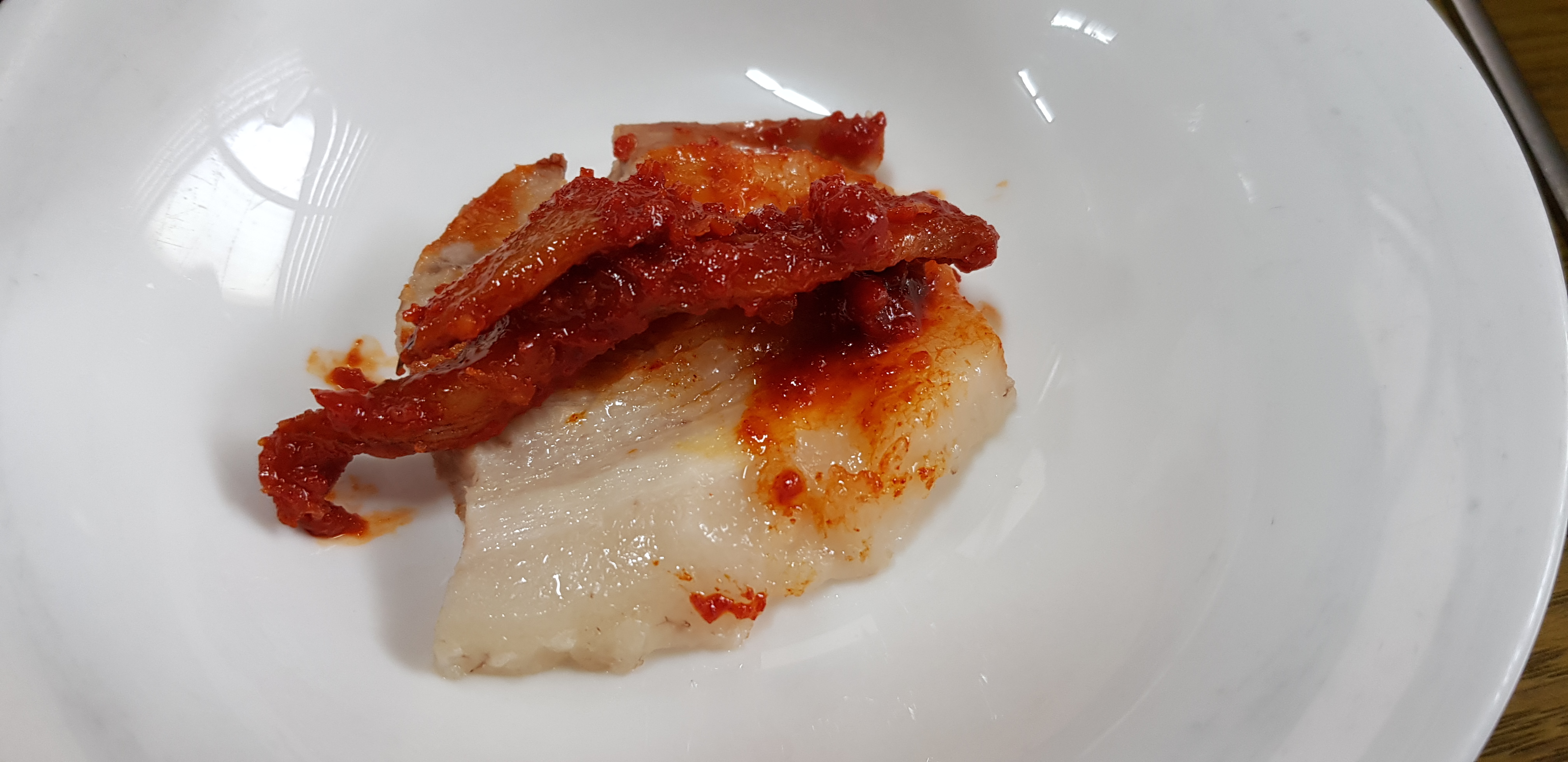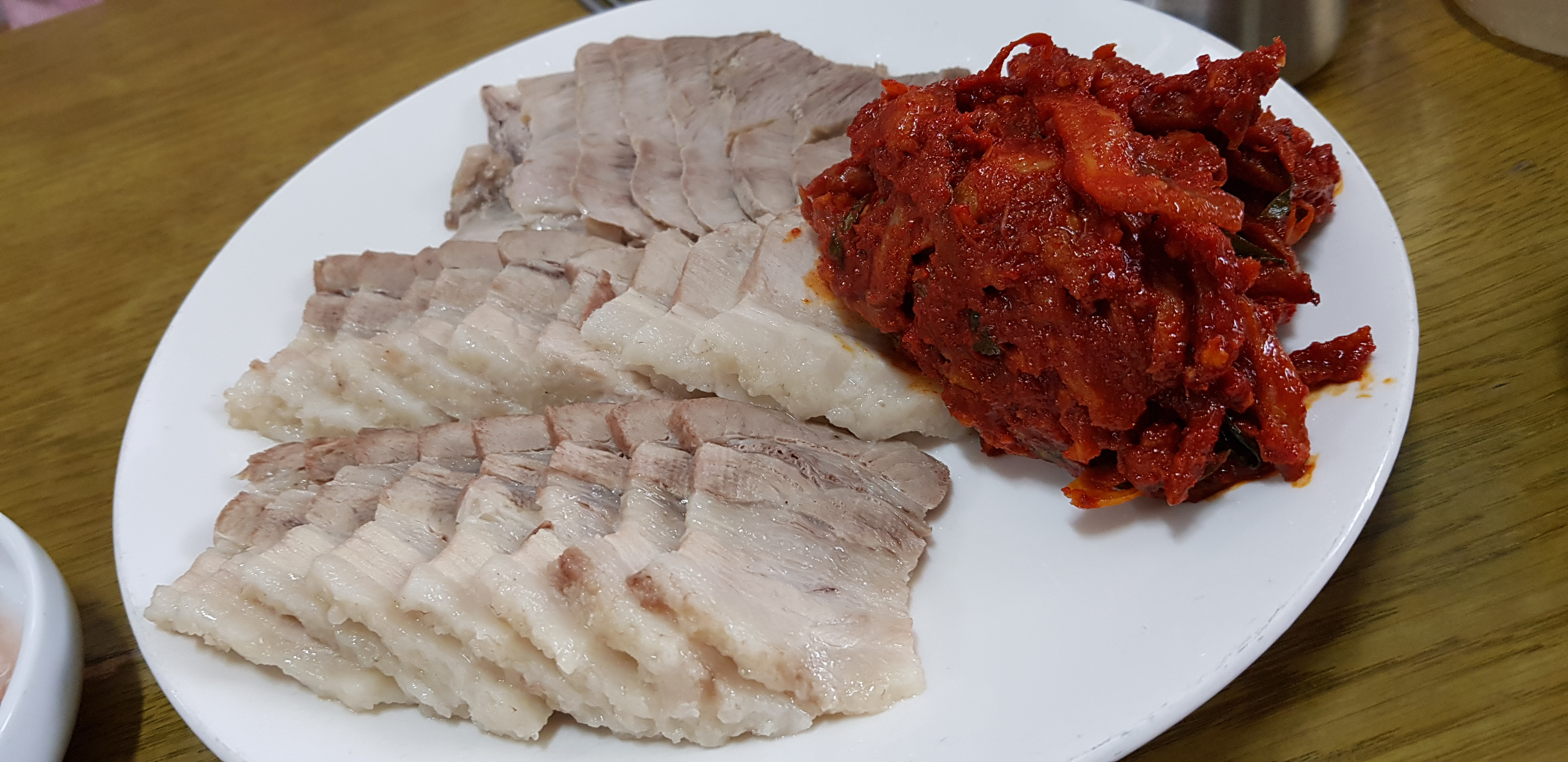 수육이 먼저 나왔습니다. 잘 삶아진 수육과 가자미 식해가 나옵니다. 수육은 삼겹살 부위와 살코기 부위가 같이 나옵니다. 제 입맛에는 비계와 함께 먹는게 부드럽고 돼지고기맛도 더 잘 나는것이 좋았습니다. 가자미식해는 새콤달콤하기보다 그냥 고추가루 양념에 버무려져 있습니다. 새콤한 맛은 없었네요. 고기와의 궁합이 좋았습니다. 일단 고기가 참 좋아서 수육 자체가 맛있습니다. 새우젓을 찍어 먹어도 김치와 먹어도 가자미식해와 먹어도 맛있었습니다.