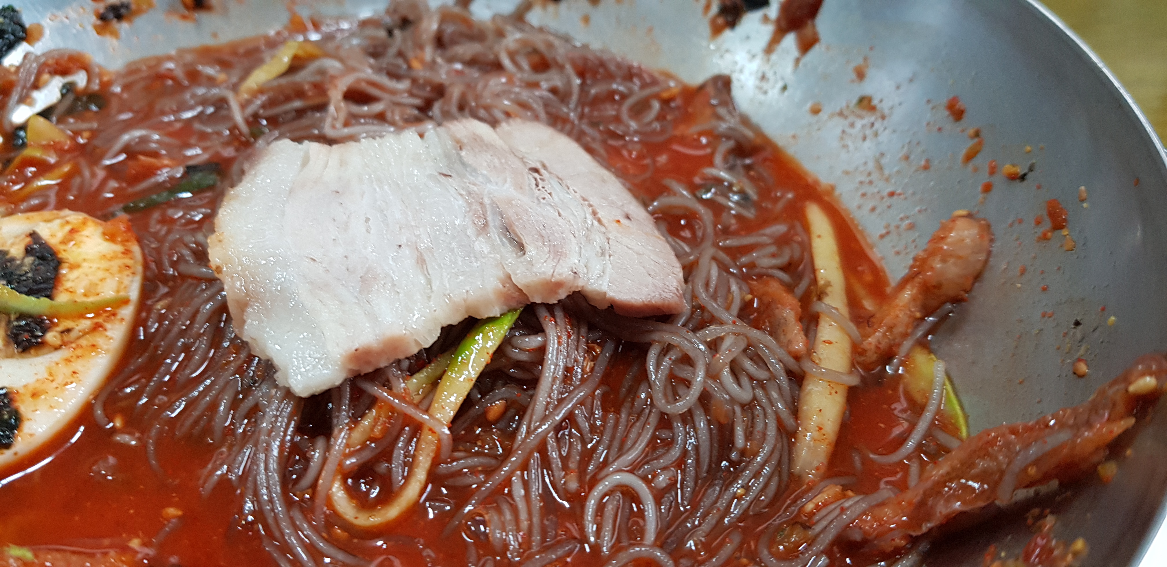양념이 많이 올라가 있어서 짜지 않을까 생각이 들었네요. 육수를 넉넉히 붓고 잘 비벼봅니다. 한입 먹어보니 생각봐는 다르게 전혀 자극적이지 않습니다. 참기름을 넉넉히 넣으셨는지 참기름 향기와 함께 조금은 심심한 맛이 났네요. 그래서 저는 겨자와 식초를 듬뿍 넣고 설탕을 넣어서 비볐습니다. 제 스타일 대로 먹어야죠 ㅎㅎ 자극적이지 않아서 어르신들이 아주 좋아하실 맛이었습니다. 양념을 추가하고 먹으니 역시 맛있네요.