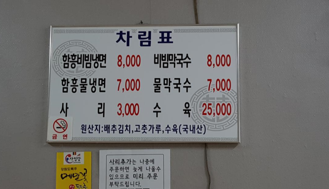 메뉴는 간단합니다. 냉면, 막국수, 수육 세가지입니다. 면은 물, 비빔으로 골라 먹을 수 있네요.