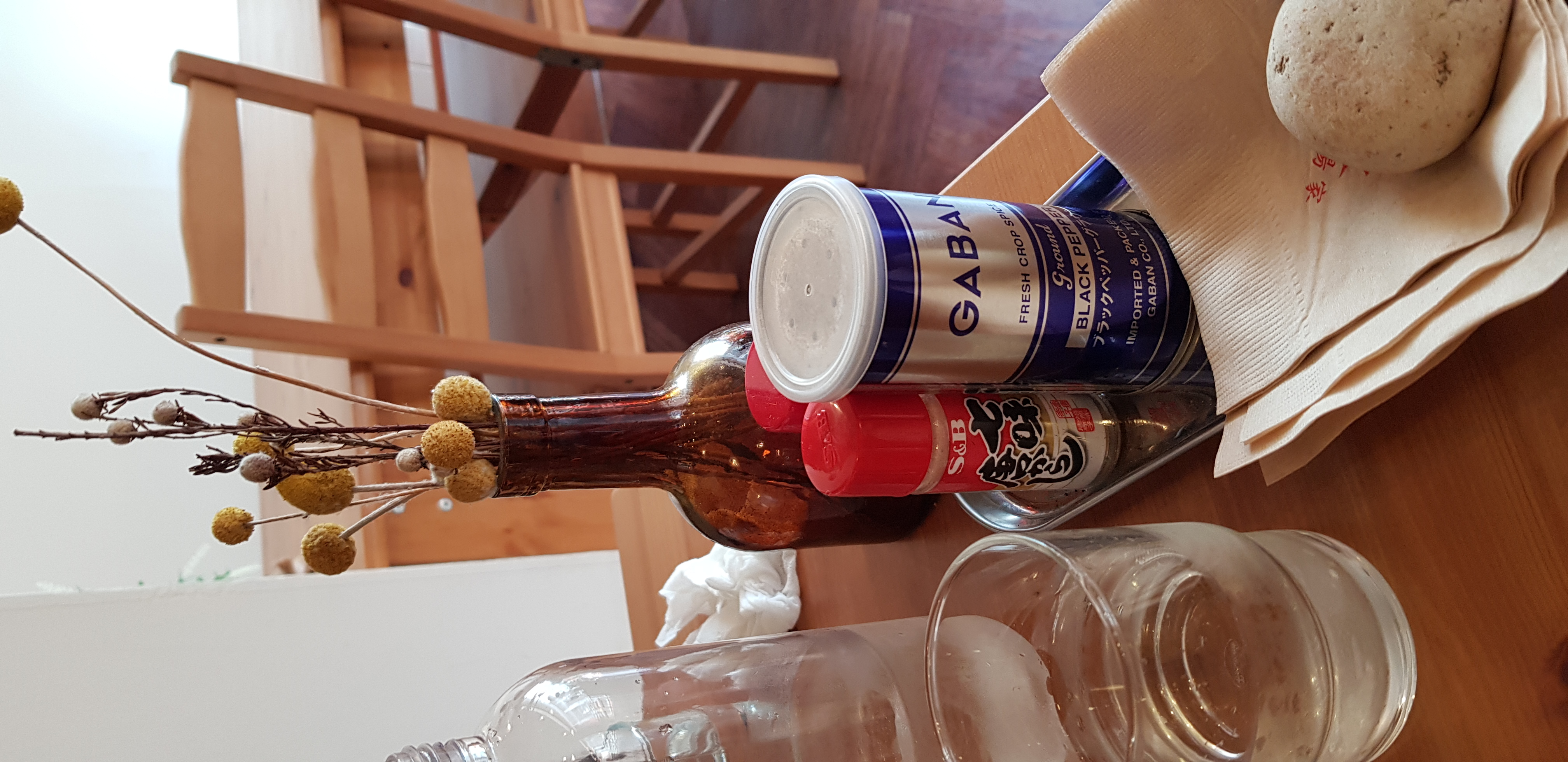 우드 테이블 위에 일본에서 팔고있는 듯한 양념들도 있습니다. 후추, 소금, 고추가루(?) 양념이 있네요.