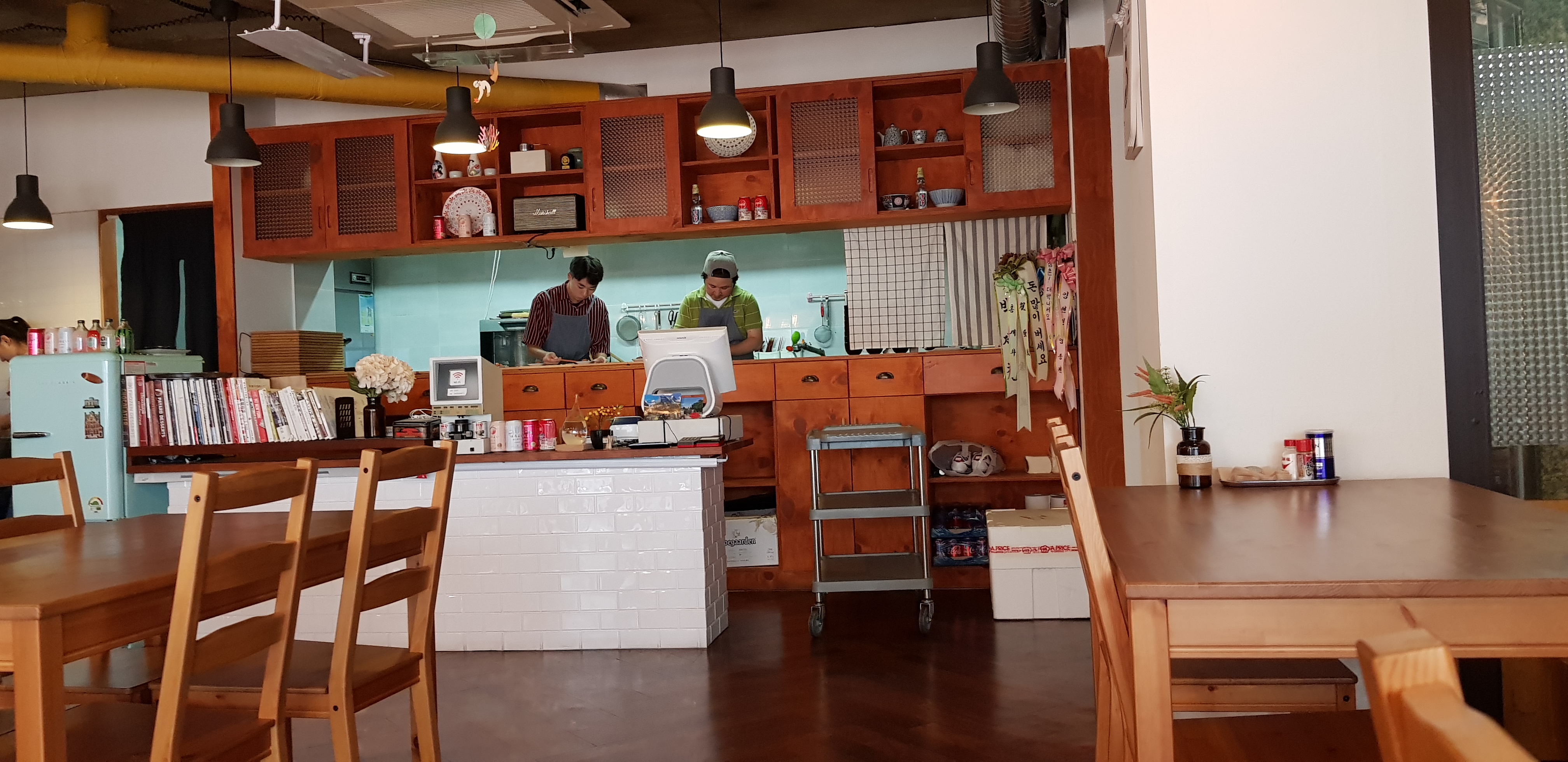 모두 입식 테이블로 되어 있고 오픈키친 구조라 음식 만드시는걸 볼수 있습니다.