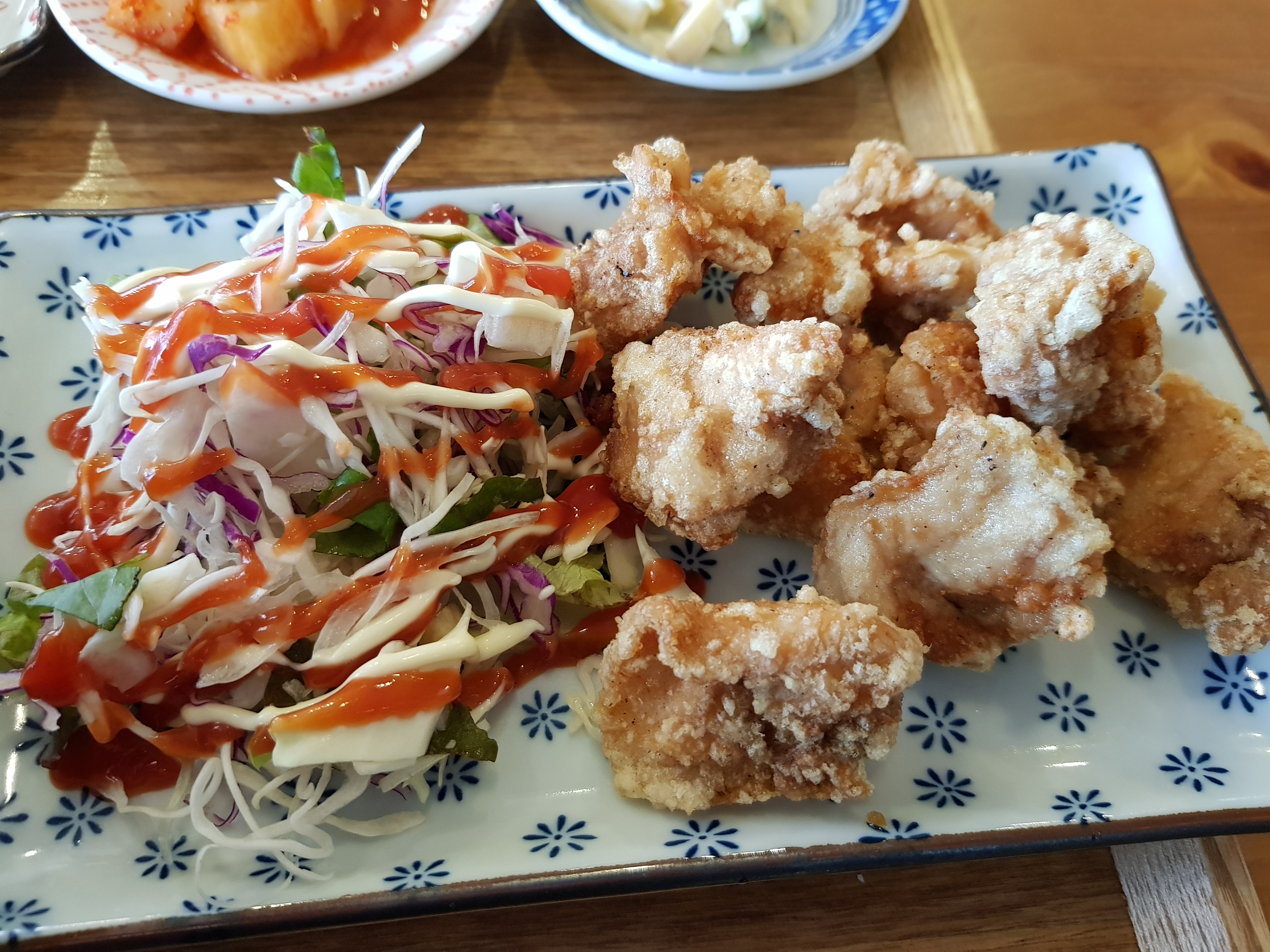 반찬으로 샐러드, 깍두기, 계란말이, 슈 같은것이 나왔는데 깍두기와 계란말이가 맛있었네요. 깍두기는 리필해서 먹었습니다. 저기 있는 슈는 먹고 나오지 않아서 정확하게 어떤지는 모르겠네요.