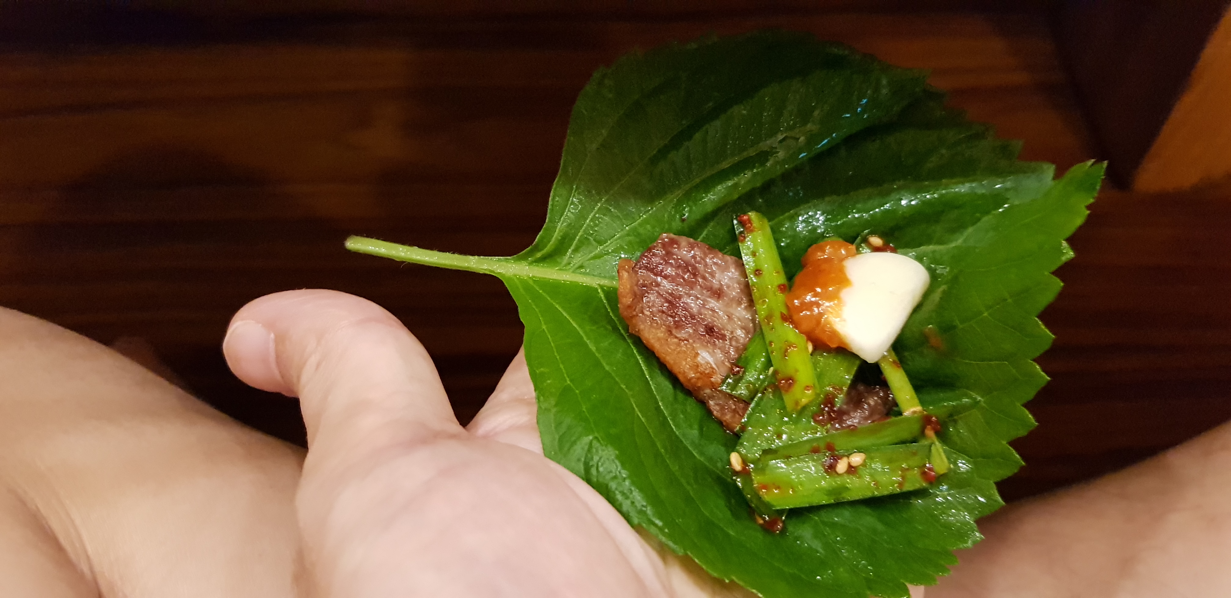 깻잎한장에 오리고기, 부추무침, 마늘과 쌈장을 올려 봅니다. 맛있네요. 소맥 한잔 있으면 더 맛있겠다는 생각이 듭니다.