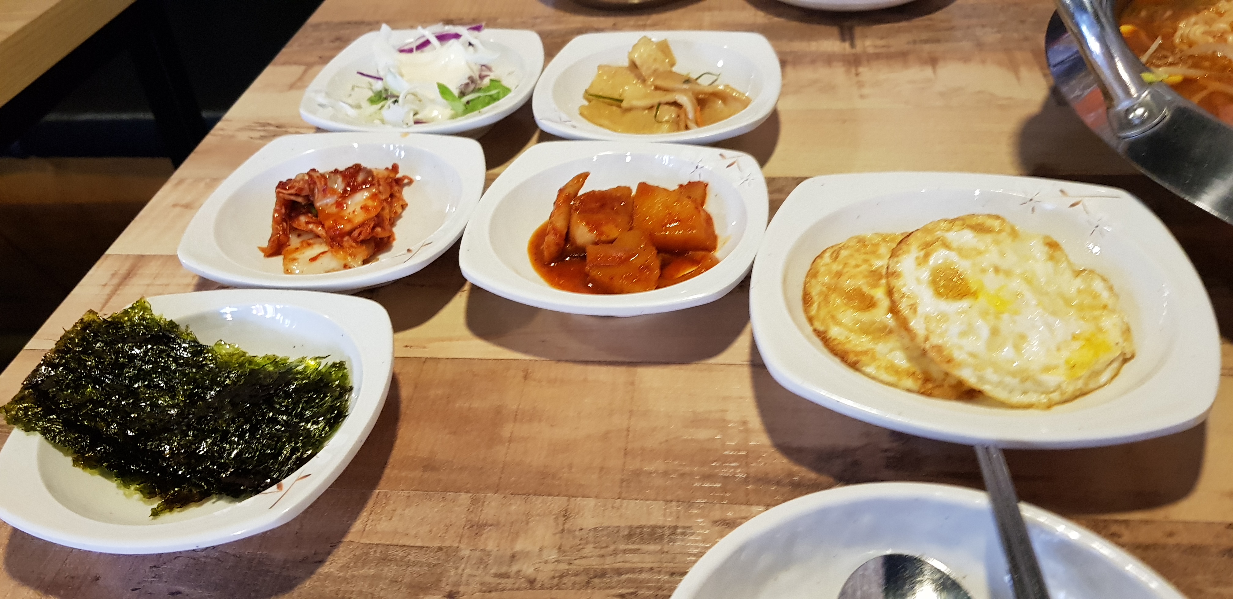 밑반찬이 먼저 세팅됩니다. 샐러드, 어묵볶음, 김치, 감자조림, 김, 계란후라이가 나옵니다. 부대찌개집 계란후라이는 보통 추가메뉴로 주문이 가능한데 이집은 기본으로 나오니 좋았습니다. 반찬들도 깔금하니 맛이 좋습니다. 김치와 어묵볶음이 맛있었네요. 반찬이 모자라시면 샐러드바에서 리필이 가능합니다. 사장님께서 친절하게 많이 드시라고 하시네요.