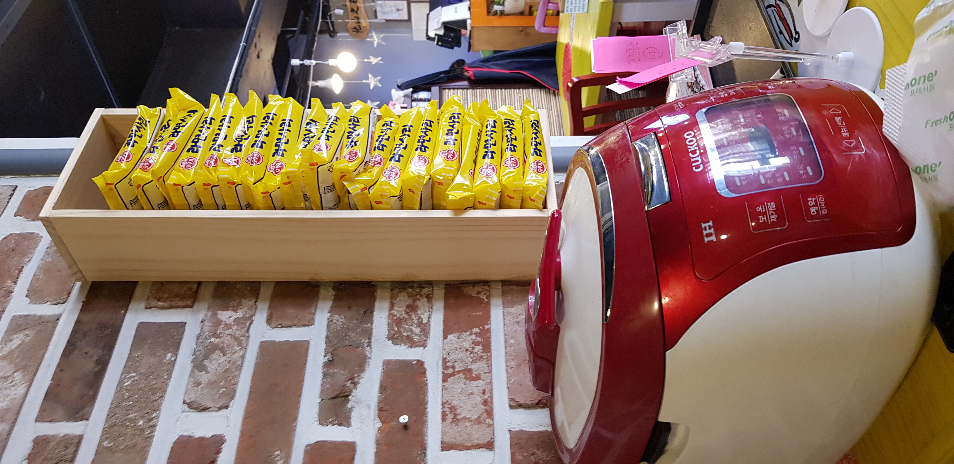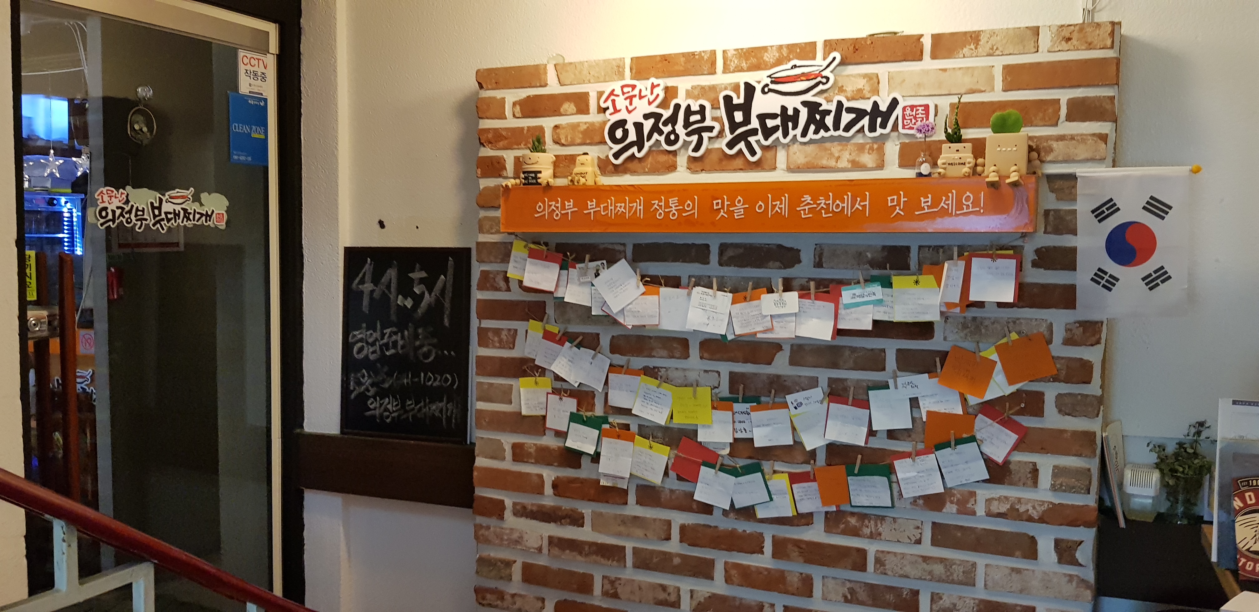 2층 입구 앞에 포스트잍 메모로 손님들이 메모를 많이 남겨주셨네요. 부대찌개는 냄새가 옷에 배기 마련인데 친절하게 패브리지도 여유있게 구비해두셨습니다. 요런 센스는 언제나 참 좋지요.