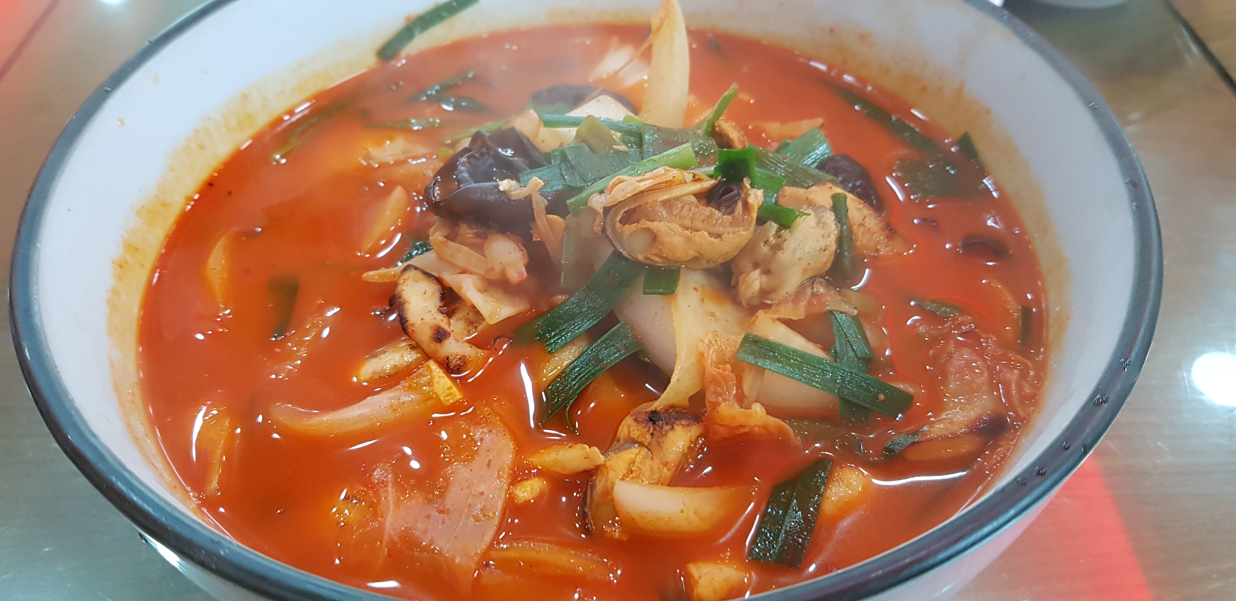 양파, 홍합, 목이버섯, 오징어, 부추등이 푸짐하게 들어 있습니다. 국물이 많이 기름지지는 않네요. 고기는 들어있는거 같지 않았습니다.