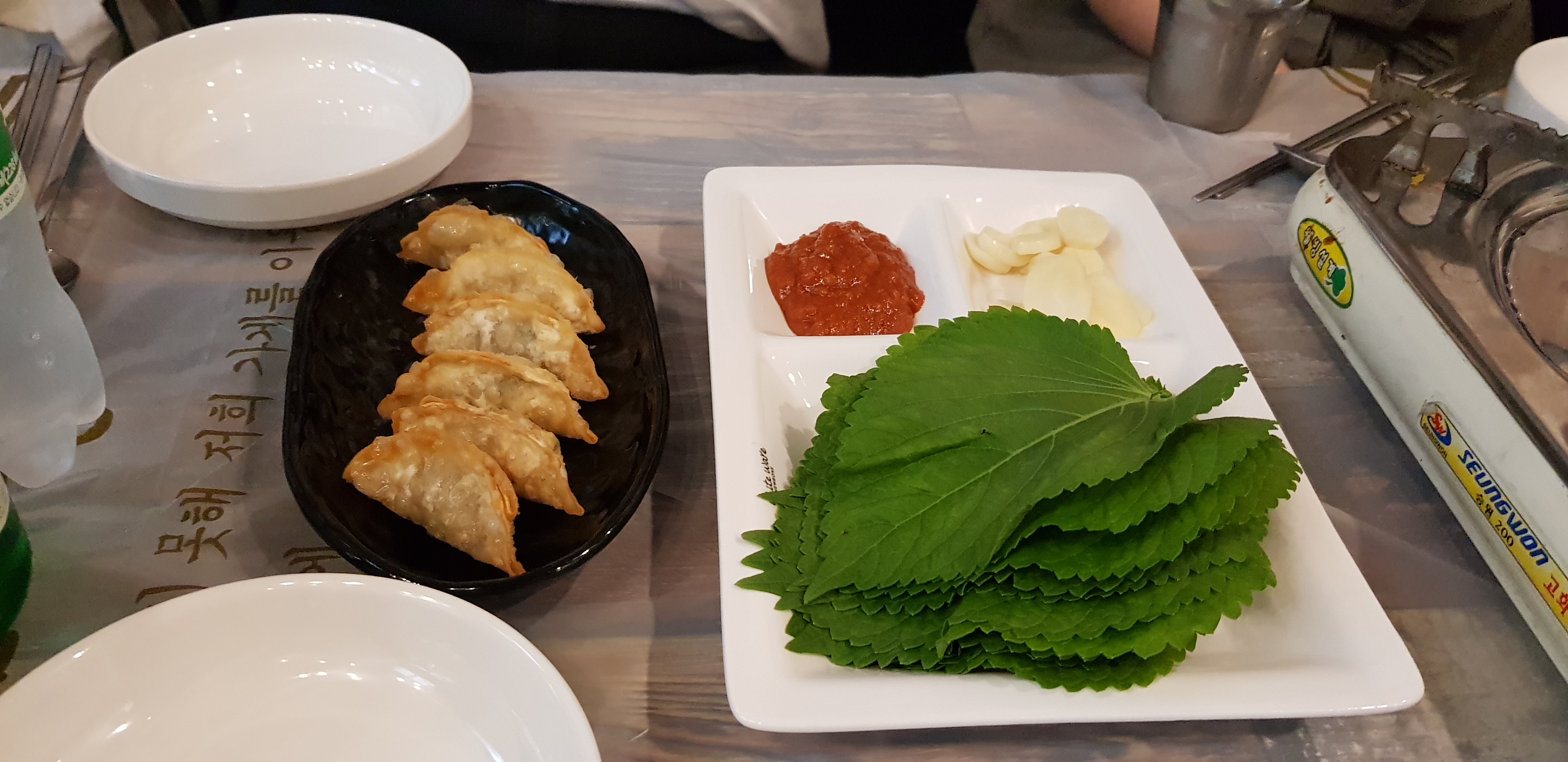 기본세팅은 튀김만두와 깻잎, 마늘, 쌈장이 나옵니다.