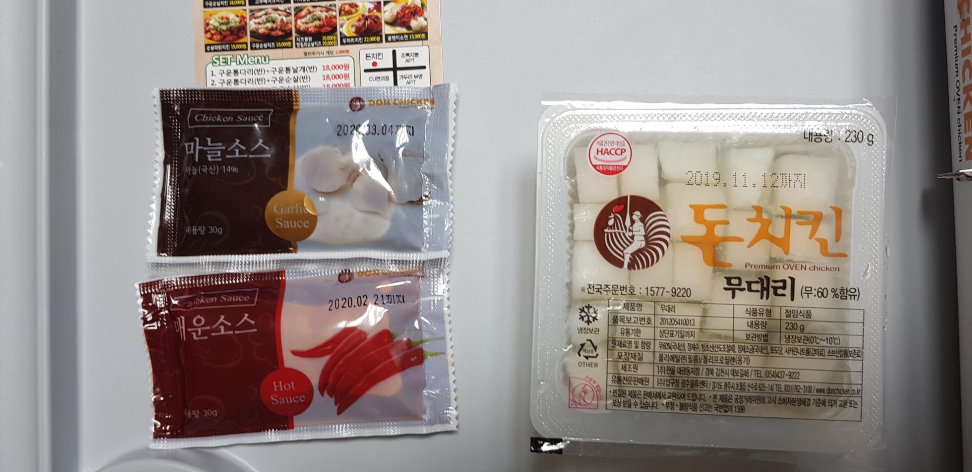 치킨무와 마늘소스, 매운소스가 들어 있습니다.